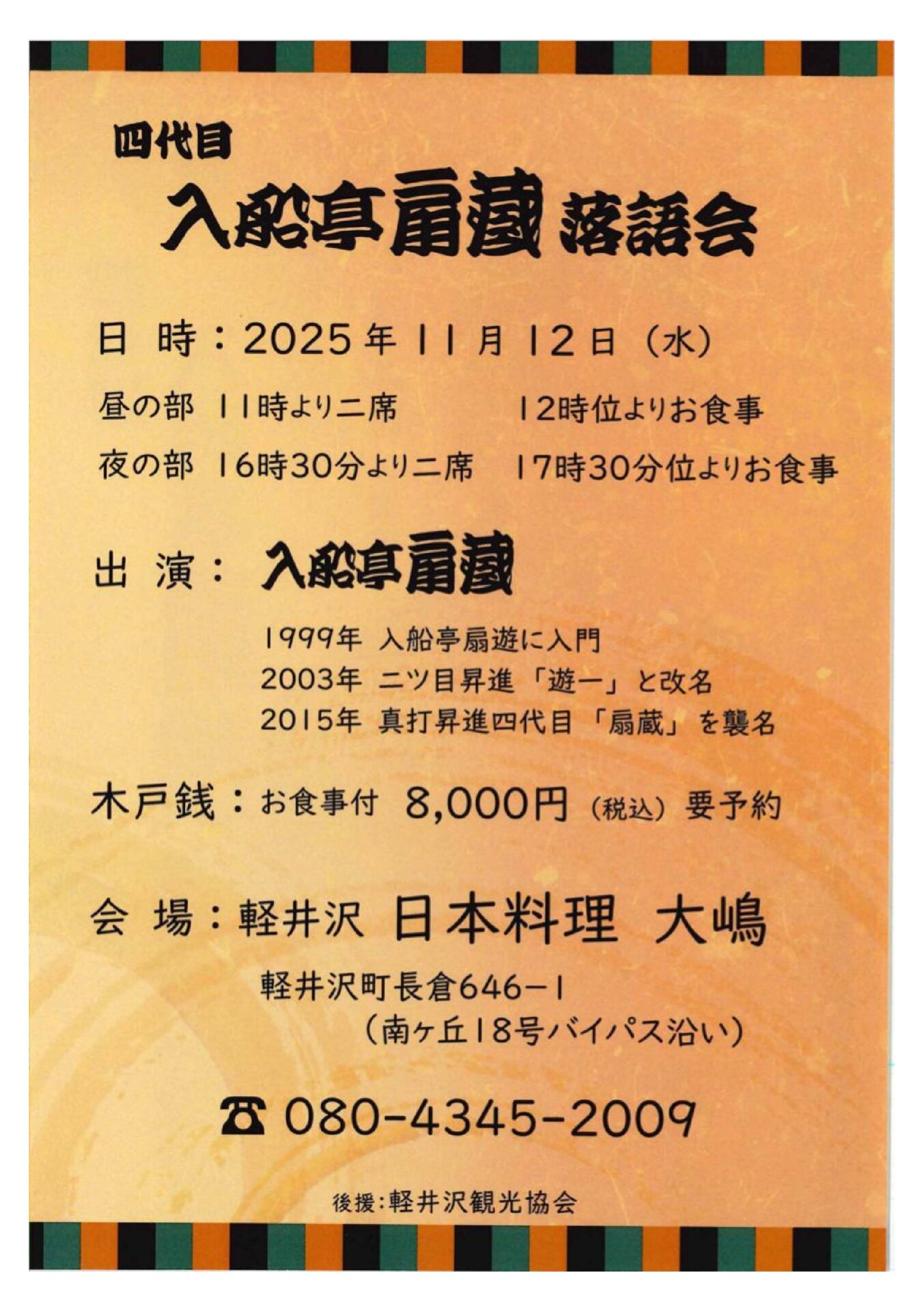 軽井沢町の日本料理 大嶋にて、四代目 入船亭扇蔵 落語会が開催されます。