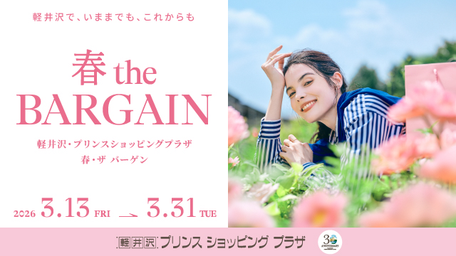 ショッピング 南軽井沢 【軽井沢・プリンスショッピングプラザ】『春theバーゲン』開催中♪ 2026.03.13〜2026.03.31 軽井沢・プリンスショッピングプラザでは、『春theバーゲン』開催しています。 春の陽気が心地よい軽井沢にぜひおでかけください♪ Information 開催日時 2026年3月13日(金)~31日(火) 開催場所 軽井沢・プリンスショッピングプラザ 交通アクセス 軽井沢駅南口すぐ URL https://www.karuizawa-psp.jp/spring2026/