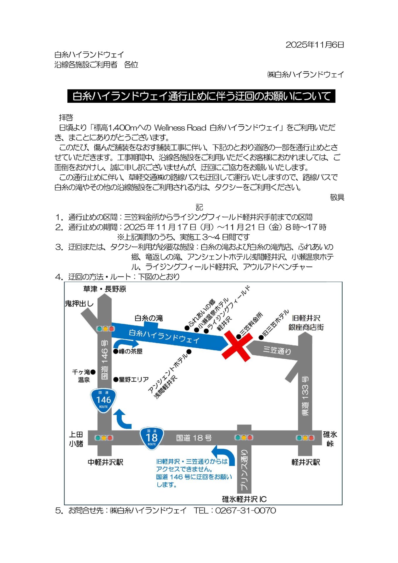 11月17~21日/白糸ハイランドウェイ道路工事による迂回のお知らせ >>