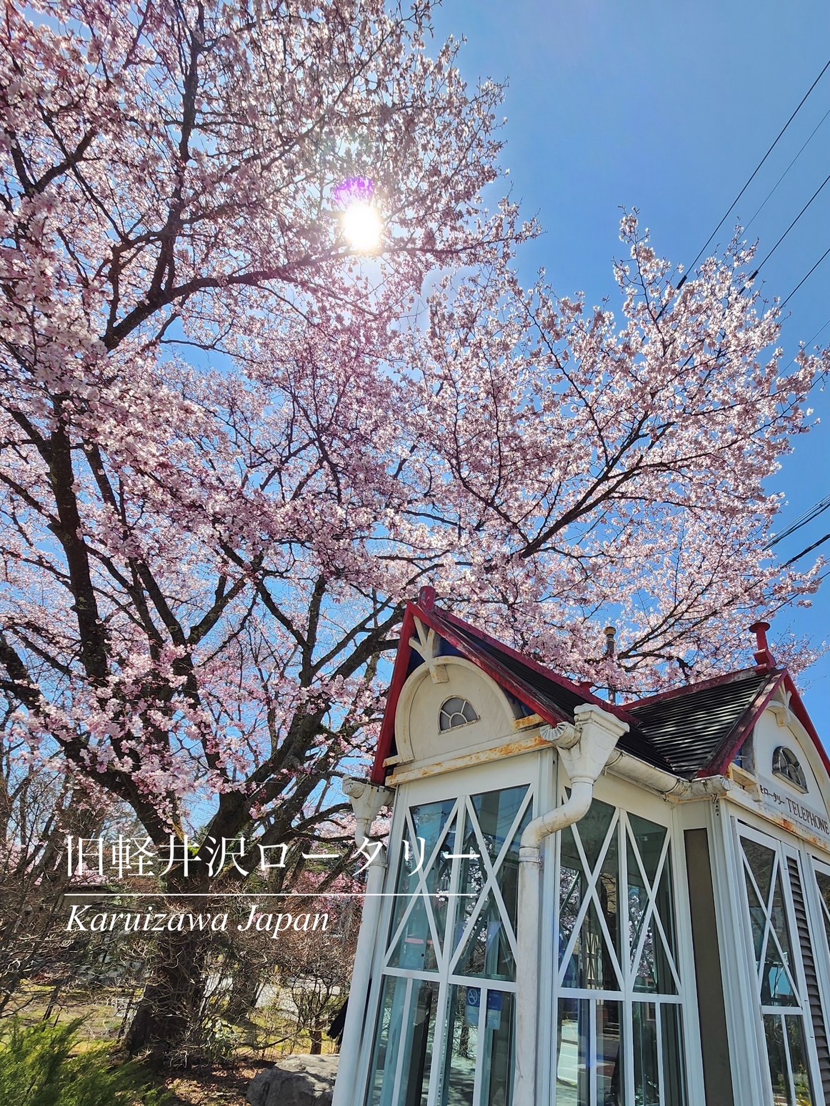 旧軽井沢ロータリーのオオヤマザクラ 2026.04.17 中山道四季の風景文学桜開花速報花 【旧軽井沢ロータリーのオオヤマザクラ】 4月16日午前8時、 気温は7.4℃、晴れです。 午前2時には、 1.6℃まで冷え込みました。 画像は、 旧軽井沢ロータリーの電話ボックスと 満開のオオヤマザクラです。 この数日の陽気で、 一気に開花しました。 夜になると、 周囲にあるレストランの明かりや 街灯が 桜を美しく照らし出します。 「祝ひとて 集ひ楽しむ 春の宵」 鹿島卯女(かじまうめ) の句を思い浮かべる 情景となります。 撮影日20260416